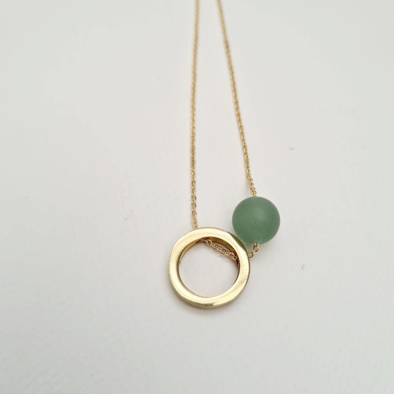 A delicate gold plated chain with a brass hollow circle with a beautiful light green matte aventurine.