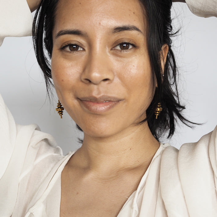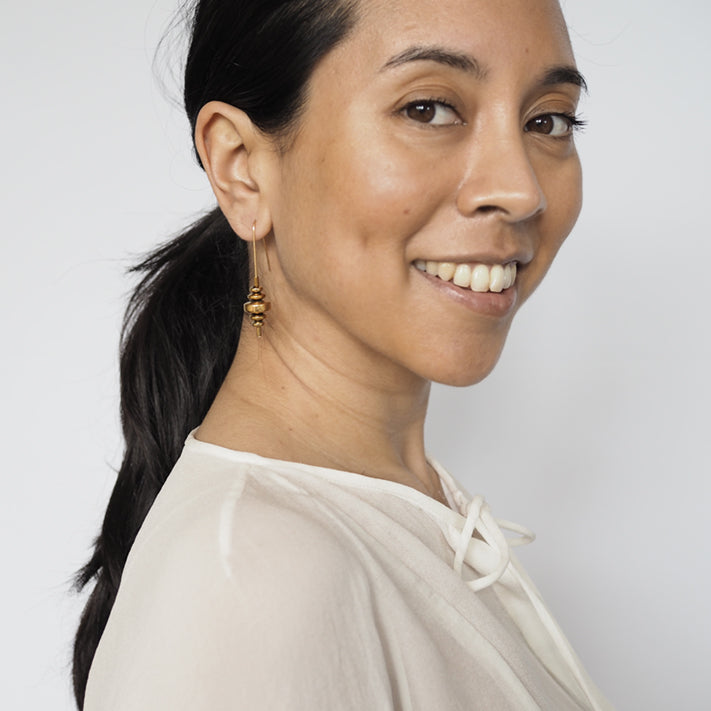Stacked Hematite on a gold-plated earring wire.