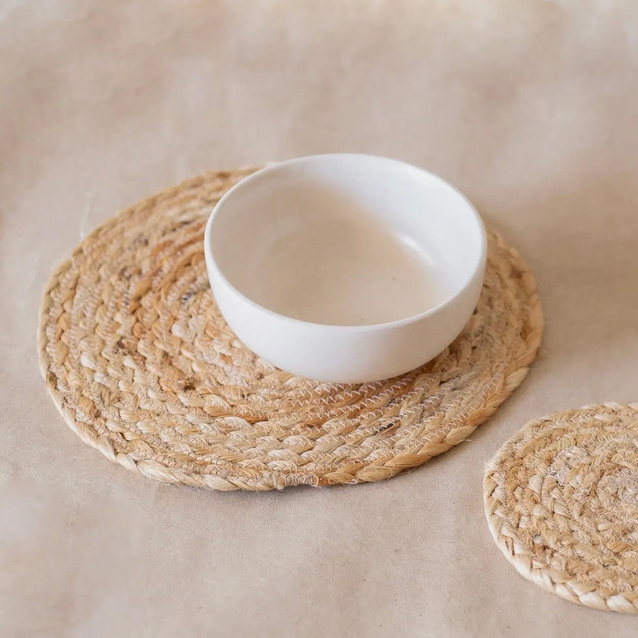 This warm and rustic dining collection is made from natural, braided Jute fibres. Available in 3 sizes.