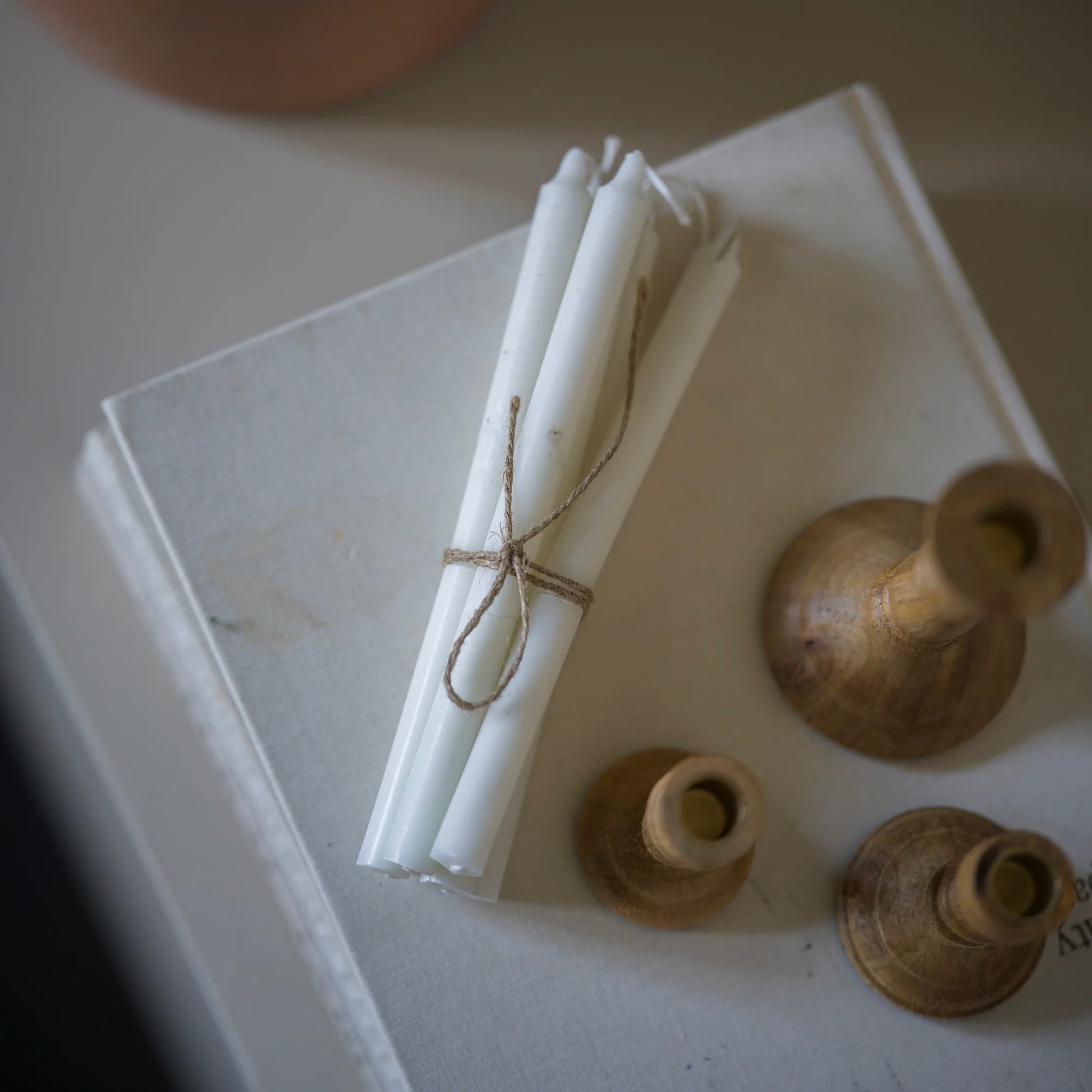 This set of six slender white candles tied simply with natural twine, With their classic silhouette and soft off-white hue.