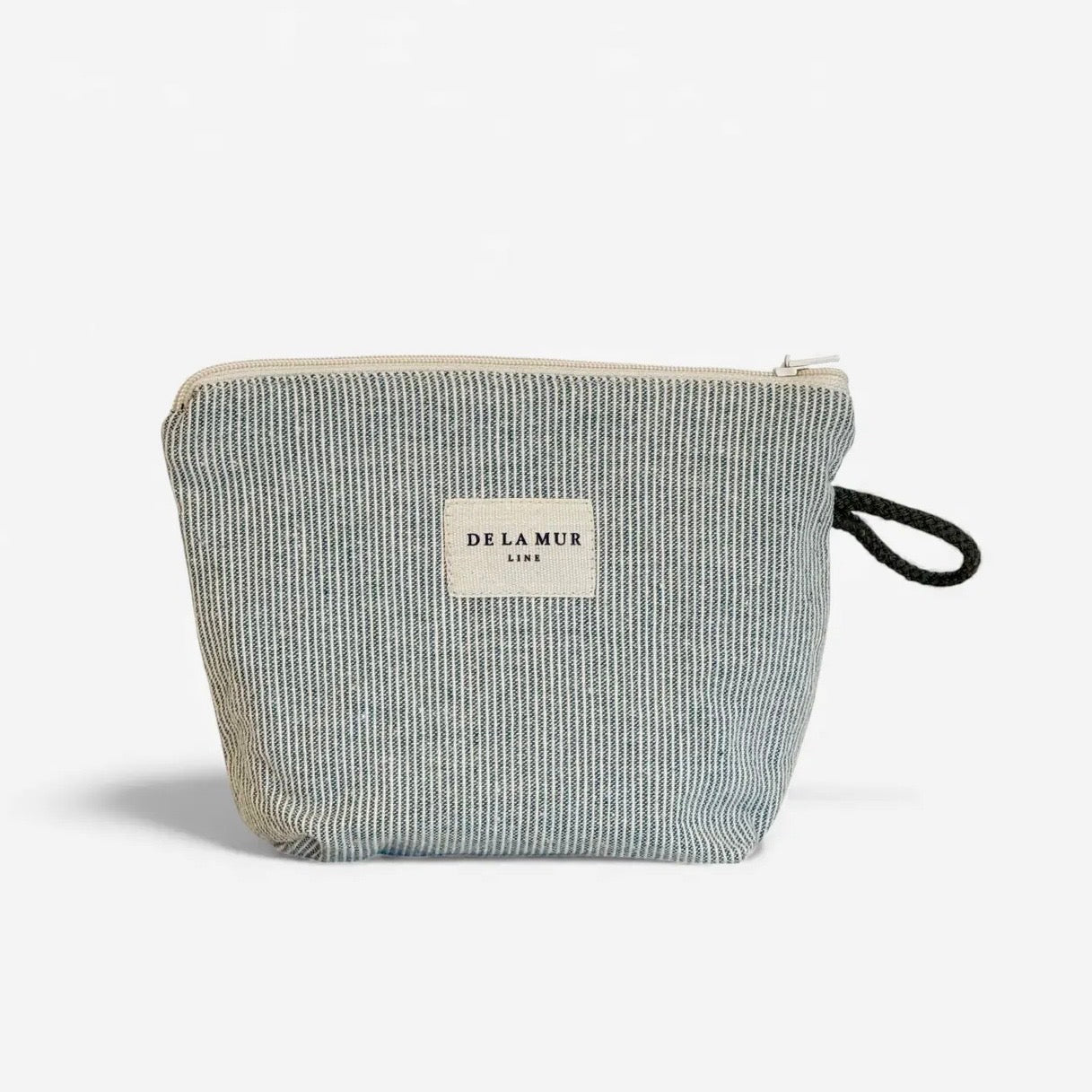 Small toiletry bag with a top zipper and cord side handle. Made of fine embossed fabric, with a light green striped print.